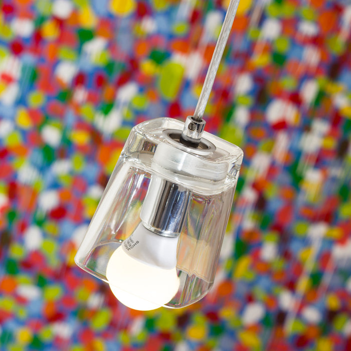 Modern series suspension lamp, chromed steel structure, glass diffuser in natural transparent glass.