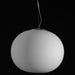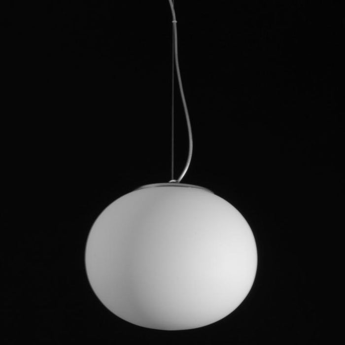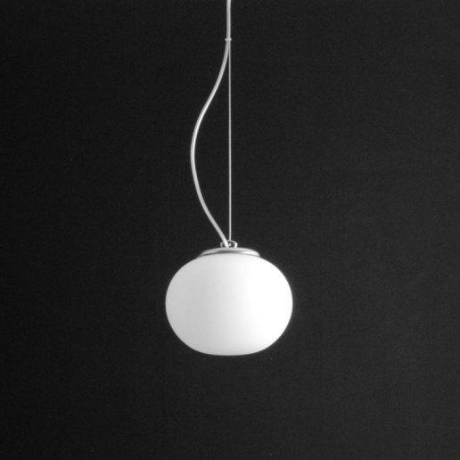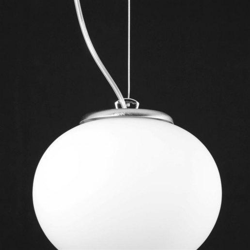 Suspension with white acid-etched triplex opal blown glass diffuser with transparent cable and steel details, brushed nickel finish.