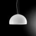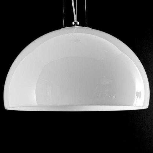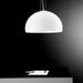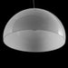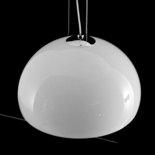 Dome suspension in white opal methacrylate, frame and ceiling fixing box in chromed steel, n. 3 steel suspension cables, with transparent feed wire.