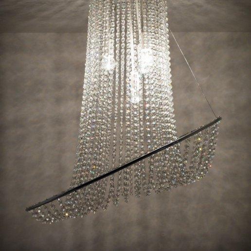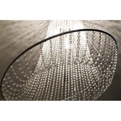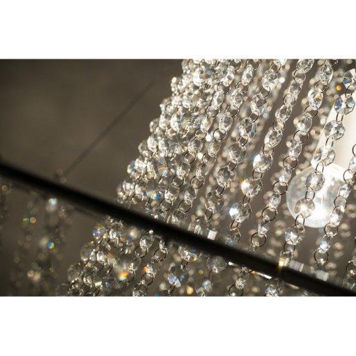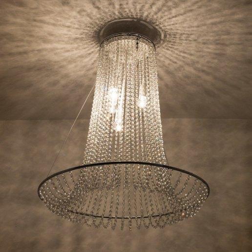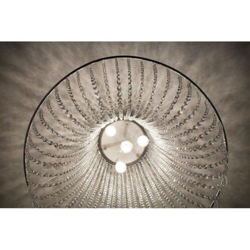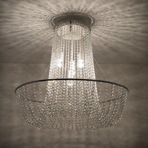 Estructura en acero pintado de blanco con detalles cromados. Realizado con cadenas de cristal asfour transparente. Gracias a los tirantes de acero es posible configurarlo en varias posiciones (ver foto). Disponible en dos tamaños: diámetro 70 cm o 100 cm. El modelo de 70 cm de diámetro está compuesto por 48 cadenas de 50 cristales para un total de 2400 asfour cristales. El modelo con un diámetro de 100 cm se compone de 63 cadenas de 55 cristales para un total de 3465 asfour cristales.