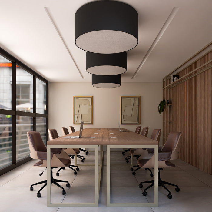 La plafoniera moderna UPP presenta un diffusore in tessuto in cotone accoppiato al pvc, disponibile nei colori nero, yuta chiaro, yuta scuro, con diametro: 90 cm. Chiusura inferiore a incastro di colore bianco, semplice, facile e veloce da pulire. Struttura in acciaio verniciato bianco.